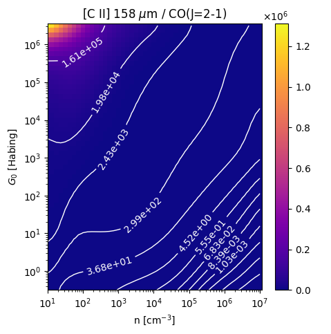 [C II] 158 µm / CO(J=2-1) Intensity Ratio emitted from the surface of a PDR as a function of the cloud density n and the FUV flux incident on the cloud G0. The above model is at a viewing angle of i=45 degrees, where i=0 is face-on. The models in the wk2020 ModelSet are based on Kaufman et al. 2006 , Wolfire et al. 2010, and Neufeld & Wolfire 2016. They use these parameters. More details are in the FITS headers.