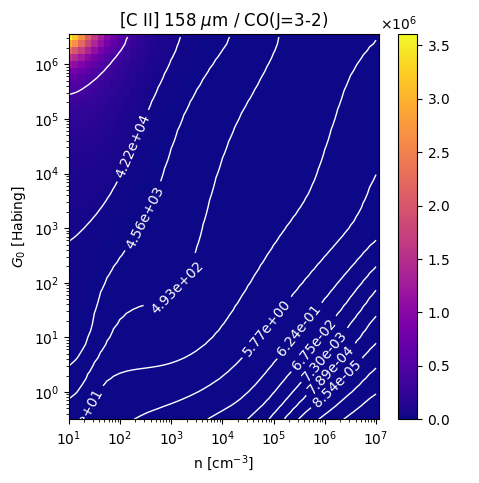 [C II] 158 µm / CO(J=3-2) Intensity Ratio emitted from the surface of a PDR as a function of the cloud density n and the FUV flux incident on the cloud G0. The above model is at a viewing angle of i=45 degrees, where i=0 is face-on. The models in the wk2020 ModelSet are based on Kaufman et al. 2006 , Wolfire et al. 2010, and Neufeld & Wolfire 2016. They use these parameters. More details are in the FITS headers.