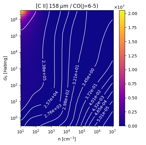 [C II] 158 µm / CO(J=6-5) Intensity Ratio emitted from the surface of a PDR as a function of the cloud density n and the FUV flux incident on the cloud G0. The above model is at a viewing angle of i=45 degrees, where i=0 is face-on. The models in the wk2020 ModelSet are based on Kaufman et al. 2006 , Wolfire et al. 2010, and Neufeld & Wolfire 2016. They use these parameters. More details are in the FITS headers.
