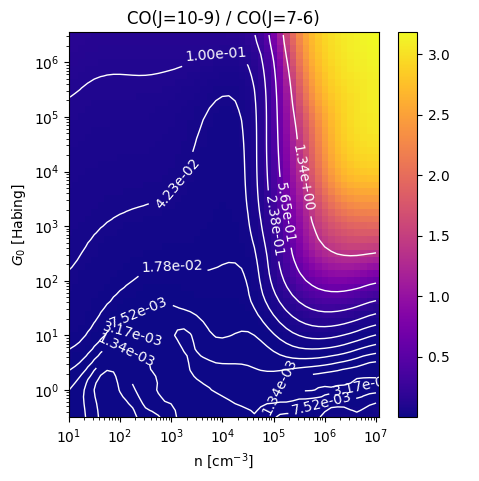 CO(J=10-9) / CO(J=7-6) Intensity Ratio emitted from the surface of a PDR as a function of the cloud density n and the FUV flux incident on the cloud G0. The above model is at a viewing angle of i=45 degrees, where i=0 is face-on. The models in the wk2020 ModelSet are based on Kaufman et al. 2006 , Wolfire et al. 2010, and Neufeld & Wolfire 2016. They use these parameters. More details are in the FITS headers.