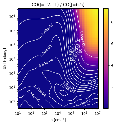 CO(J=12-11) / CO(J=6-5) Intensity Ratio emitted from the surface of a PDR as a function of the cloud density n and the FUV flux incident on the cloud G0. The above model is at a viewing angle of i=45 degrees, where i=0 is face-on. The models in the wk2020 ModelSet are based on Kaufman et al. 2006 , Wolfire et al. 2010, and Neufeld & Wolfire 2016. They use these parameters. More details are in the FITS headers.
