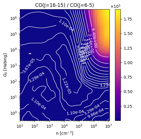 CO(J=16-15) / CO(J=6-5) Intensity Ratio emitted from the surface of a PDR as a function of the cloud density n and the FUV flux incident on the cloud G0. The above model is at a viewing angle of i=45 degrees, where i=0 is face-on. The models in the wk2020 ModelSet are based on Kaufman et al. 2006 , Wolfire et al. 2010, and Neufeld & Wolfire 2016. They use these parameters. More details are in the FITS headers.