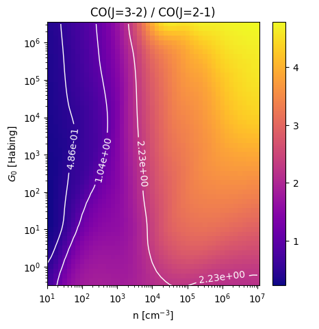 CO(J=3-2) / CO(J=2-1) Intensity Ratio emitted from the surface of a PDR as a function of the cloud density n and the FUV flux incident on the cloud G0. The above model is at a viewing angle of i=45 degrees, where i=0 is face-on. The models in the wk2020 ModelSet are based on Kaufman et al. 2006 , Wolfire et al. 2010, and Neufeld & Wolfire 2016. They use these parameters. More details are in the FITS headers.