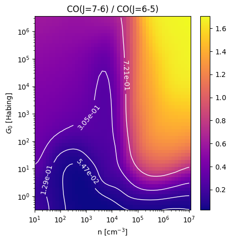 CO(J=7-6) / CO(J=6-5) Intensity Ratio emitted from the surface of a PDR as a function of the cloud density n and the FUV flux incident on the cloud G0. The above model is at a viewing angle of i=45 degrees, where i=0 is face-on. The models in the wk2020 ModelSet are based on Kaufman et al. 2006 , Wolfire et al. 2010, and Neufeld & Wolfire 2016. They use these parameters. More details are in the FITS headers.