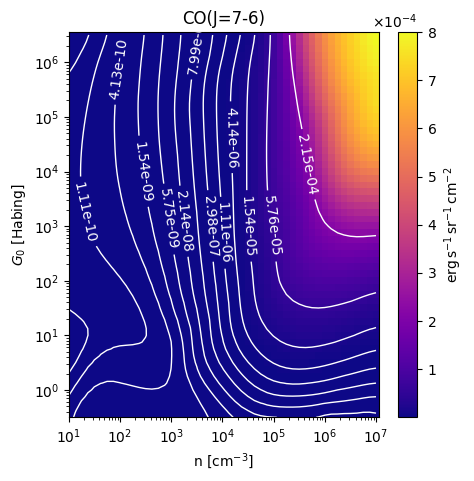 CO(J=7-6) Intensity emitted from the surface of a PDR as a function of the cloud density n and the FUV flux incident on the cloud G0. The above model is at a viewing angle of i=45 degrees, where i=0 is face-on. The models in the wk2020 ModelSet are based on Kaufman et al. 2006 , Wolfire et al. 2010, and Neufeld & Wolfire 2016. They use these parameters. More details are in the FITS headers.