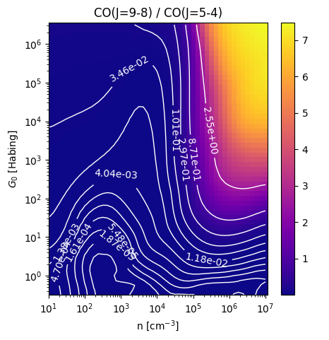 CO(J=9-8) / CO(J=5-4) Intensity Ratio emitted from the surface of a PDR as a function of the cloud density n and the FUV flux incident on the cloud G0. The above model is at a viewing angle of i=45 degrees, where i=0 is face-on. The models in the wk2020 ModelSet are based on Kaufman et al. 2006 , Wolfire et al. 2010, and Neufeld & Wolfire 2016. They use these parameters. More details are in the FITS headers.