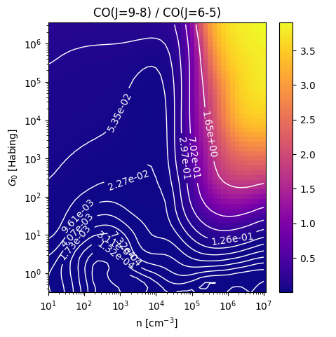 CO(J=9-8) / CO(J=6-5) Intensity Ratio emitted from the surface of a PDR as a function of the cloud density n and the FUV flux incident on the cloud G0. The above model is at a viewing angle of i=45 degrees, where i=0 is face-on. The models in the wk2020 ModelSet are based on Kaufman et al. 2006 , Wolfire et al. 2010, and Neufeld & Wolfire 2016. They use these parameters. More details are in the FITS headers.