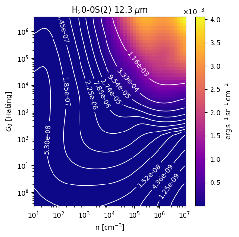 H20-0S(2) 12.3 µm Intensity emitted from the surface of a PDR as a function of the cloud density n and the FUV flux incident on the cloud G0. The above model is at a viewing angle of i=45 degrees, where i=0 is face-on. The models in the wk2020 ModelSet are based on Kaufman et al. 2006 , Wolfire et al. 2010, and Neufeld & Wolfire 2016. They use these parameters. More details are in the FITS headers.