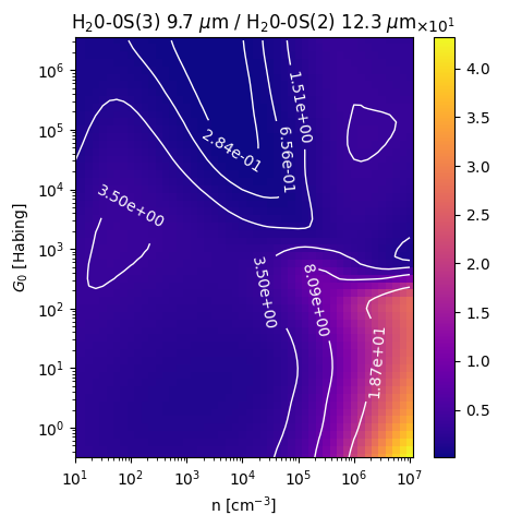 H20-0S(3) 9.7 µm / H20-0S(2) 12.3 µm Intensity Ratio emitted from the surface of a PDR as a function of the cloud density n and the FUV flux incident on the cloud G0. The above model is at a viewing angle of i=45 degrees, where i=0 is face-on. The models in the wk2020 ModelSet are based on Kaufman et al. 2006 , Wolfire et al. 2010, and Neufeld & Wolfire 2016. They use these parameters. More details are in the FITS headers.