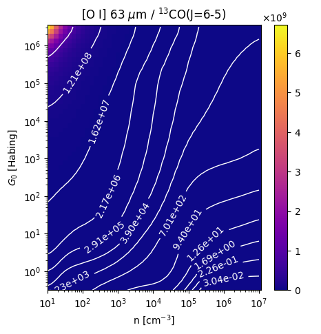 [O I] 63 µm / 13CO(J=6-5) Intensity Ratio emitted from the surface of a PDR as a function of the cloud density n and the FUV flux incident on the cloud G0. The above model is at a viewing angle of i=45 degrees, where i=0 is face-on. The models in the wk2020 ModelSet are based on Kaufman et al. 2006 , Wolfire et al. 2010, and Neufeld & Wolfire 2016. They use these parameters. More details are in the FITS headers.