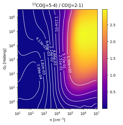 13CO(J=5-4) / CO(J=2-1) Intensity Ratio emitted from the surface of a PDR as a function of the cloud density n and the FUV flux incident on the cloud G0. The above model is at a viewing angle of i=60 degrees, where i=0 is face-on. The models in the wk2020 ModelSet are based on Kaufman et al. 2006 , Wolfire et al. 2010, and Neufeld & Wolfire 2016. They use these parameters. More details are in the FITS headers.