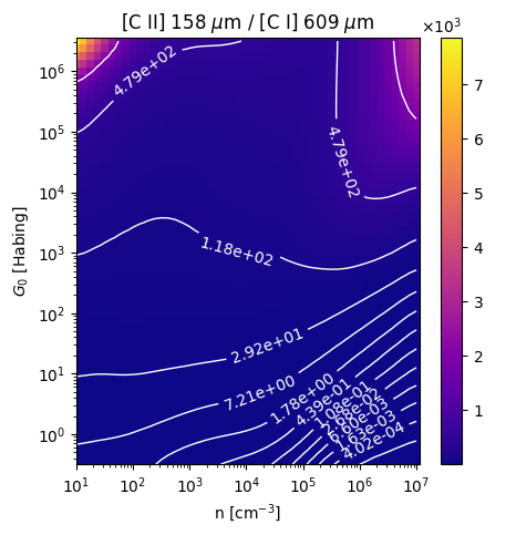 [C II] 158 µm / [C I] 609 µm Intensity Ratio emitted from the surface of a PDR as a function of the cloud density n and the FUV flux incident on the cloud G0. The above model is at a viewing angle of i=60 degrees, where i=0 is face-on. The models in the wk2020 ModelSet are based on Kaufman et al. 2006 , Wolfire et al. 2010, and Neufeld & Wolfire 2016. They use these parameters. More details are in the FITS headers.