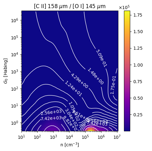[C II] 158 µm / [O I] 145 µm Intensity Ratio emitted from the surface of a PDR as a function of the cloud density n and the FUV flux incident on the cloud G0. The above model is at a viewing angle of i=60 degrees, where i=0 is face-on. The models in the wk2020 ModelSet are based on Kaufman et al. 2006 , Wolfire et al. 2010, and Neufeld & Wolfire 2016. They use these parameters. More details are in the FITS headers.