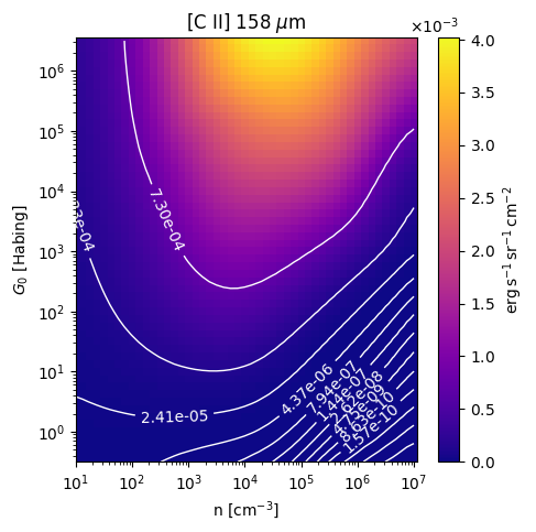 [C II] 158 µm Intensity emitted from the surface of a PDR as a function of the cloud density n and the FUV flux incident on the cloud G0. The above model is at a viewing angle of i=60 degrees, where i=0 is face-on. The models in the wk2020 ModelSet are based on Kaufman et al. 2006 , Wolfire et al. 2010, and Neufeld & Wolfire 2016. They use these parameters. More details are in the FITS headers.