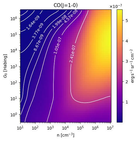 CO(J=1-0) Intensity emitted from the surface of a PDR as a function of the cloud density n and the FUV flux incident on the cloud G0. The above model is at a viewing angle of i=60 degrees, where i=0 is face-on. The models in the wk2020 ModelSet are based on Kaufman et al. 2006 , Wolfire et al. 2010, and Neufeld & Wolfire 2016. They use these parameters. More details are in the FITS headers.