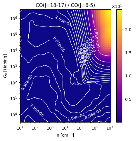 CO(J=18-17) / CO(J=6-5) Intensity Ratio emitted from the surface of a PDR as a function of the cloud density n and the FUV flux incident on the cloud G0. The above model is at a viewing angle of i=60 degrees, where i=0 is face-on. The models in the wk2020 ModelSet are based on Kaufman et al. 2006 , Wolfire et al. 2010, and Neufeld & Wolfire 2016. They use these parameters. More details are in the FITS headers.