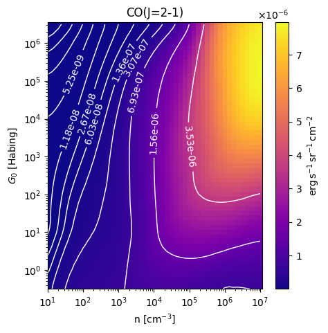 CO(J=2-1) Intensity emitted from the surface of a PDR as a function of the cloud density n and the FUV flux incident on the cloud G0. The above model is at a viewing angle of i=60 degrees, where i=0 is face-on. The models in the wk2020 ModelSet are based on Kaufman et al. 2006 , Wolfire et al. 2010, and Neufeld & Wolfire 2016. They use these parameters. More details are in the FITS headers.