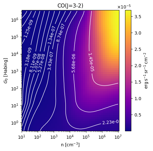 CO(J=3-2) Intensity emitted from the surface of a PDR as a function of the cloud density n and the FUV flux incident on the cloud G0. The above model is at a viewing angle of i=60 degrees, where i=0 is face-on. The models in the wk2020 ModelSet are based on Kaufman et al. 2006 , Wolfire et al. 2010, and Neufeld & Wolfire 2016. They use these parameters. More details are in the FITS headers.