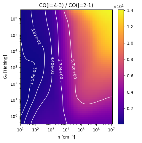 CO(J=4-3) / CO(J=2-1) Intensity Ratio emitted from the surface of a PDR as a function of the cloud density n and the FUV flux incident on the cloud G0. The above model is at a viewing angle of i=60 degrees, where i=0 is face-on. The models in the wk2020 ModelSet are based on Kaufman et al. 2006 , Wolfire et al. 2010, and Neufeld & Wolfire 2016. They use these parameters. More details are in the FITS headers.