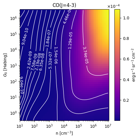 CO(J=4-3) Intensity emitted from the surface of a PDR as a function of the cloud density n and the FUV flux incident on the cloud G0. The above model is at a viewing angle of i=60 degrees, where i=0 is face-on. The models in the wk2020 ModelSet are based on Kaufman et al. 2006 , Wolfire et al. 2010, and Neufeld & Wolfire 2016. They use these parameters. More details are in the FITS headers.