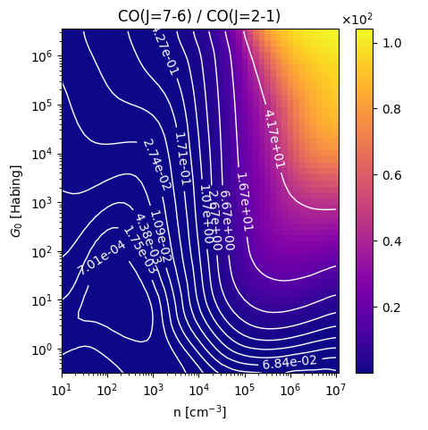CO(J=7-6) / CO(J=2-1) Intensity Ratio emitted from the surface of a PDR as a function of the cloud density n and the FUV flux incident on the cloud G0. The above model is at a viewing angle of i=60 degrees, where i=0 is face-on. The models in the wk2020 ModelSet are based on Kaufman et al. 2006 , Wolfire et al. 2010, and Neufeld & Wolfire 2016. They use these parameters. More details are in the FITS headers.