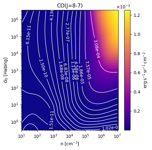 CO(J=8-7) Intensity emitted from the surface of a PDR as a function of the cloud density n and the FUV flux incident on the cloud G0. The above model is at a viewing angle of i=60 degrees, where i=0 is face-on. The models in the wk2020 ModelSet are based on Kaufman et al. 2006 , Wolfire et al. 2010, and Neufeld & Wolfire 2016. They use these parameters. More details are in the FITS headers.