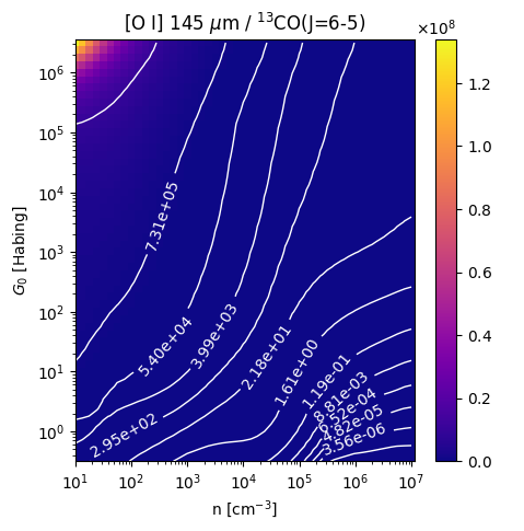[O I] 145 µm / 13CO(J=6-5) Intensity Ratio emitted from the surface of a PDR as a function of the cloud density n and the FUV flux incident on the cloud G0. The above model is at a viewing angle of i=60 degrees, where i=0 is face-on. The models in the wk2020 ModelSet are based on Kaufman et al. 2006 , Wolfire et al. 2010, and Neufeld & Wolfire 2016. They use these parameters. More details are in the FITS headers.