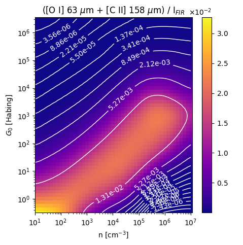 ([O I] 63 µm + [C II] 158 µm) / IFIR Intensity Ratio emitted from the surface of a PDR as a function of the cloud density n and the FUV flux incident on the cloud G0. The above model is at a viewing angle of i=60 degrees, where i=0 is face-on. The models in the wk2020 ModelSet are based on Kaufman et al. 2006 , Wolfire et al. 2010, and Neufeld & Wolfire 2016. They use these parameters. More details are in the FITS headers.
