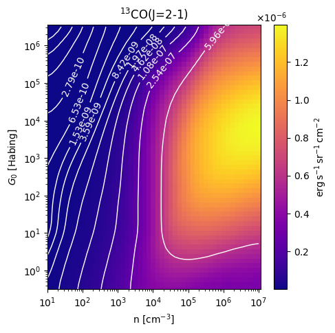 13CO(J=2-1) Intensity emitted from the surface of a PDR as a function of the cloud density n and the FUV flux incident on the cloud G0. The above model is at a viewing angle of i=75 degrees, where i=0 is face-on. The models in the wk2020 ModelSet are based on Kaufman et al. 2006 , Wolfire et al. 2010, and Neufeld & Wolfire 2016. They use these parameters. More details are in the FITS headers.