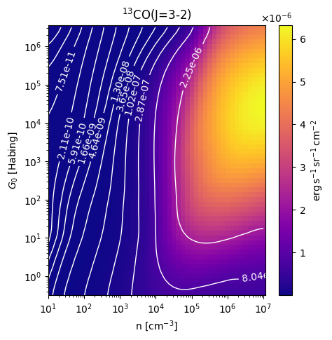 13CO(J=3-2) Intensity emitted from the surface of a PDR as a function of the cloud density n and the FUV flux incident on the cloud G0. The above model is at a viewing angle of i=75 degrees, where i=0 is face-on. The models in the wk2020 ModelSet are based on Kaufman et al. 2006 , Wolfire et al. 2010, and Neufeld & Wolfire 2016. They use these parameters. More details are in the FITS headers.