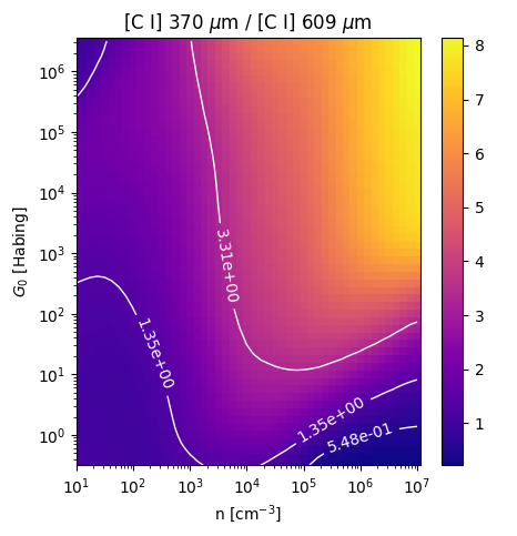 [C I] 370 µm / [C I] 609 µm Intensity Ratio emitted from the surface of a PDR as a function of the cloud density n and the FUV flux incident on the cloud G0. The above model is at a viewing angle of i=75 degrees, where i=0 is face-on. The models in the wk2020 ModelSet are based on Kaufman et al. 2006 , Wolfire et al. 2010, and Neufeld & Wolfire 2016. They use these parameters. More details are in the FITS headers.