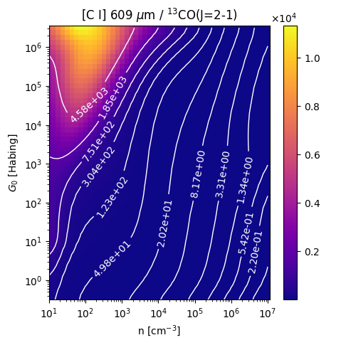 [C I] 609 µm / 13CO(J=2-1) Intensity Ratio emitted from the surface of a PDR as a function of the cloud density n and the FUV flux incident on the cloud G0. The above model is at a viewing angle of i=75 degrees, where i=0 is face-on. The models in the wk2020 ModelSet are based on Kaufman et al. 2006 , Wolfire et al. 2010, and Neufeld & Wolfire 2016. They use these parameters. More details are in the FITS headers.