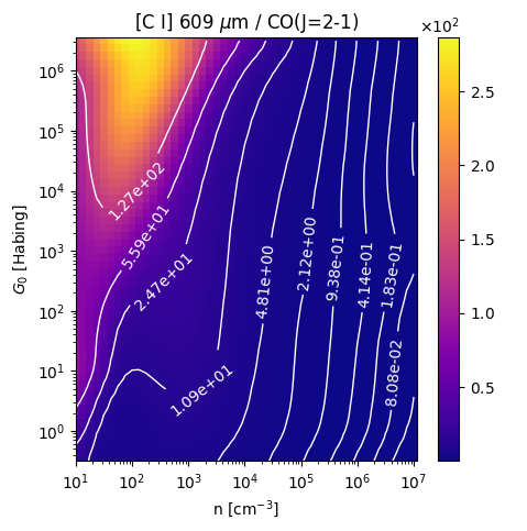 [C I] 609 µm / CO(J=2-1) Intensity Ratio emitted from the surface of a PDR as a function of the cloud density n and the FUV flux incident on the cloud G0. The above model is at a viewing angle of i=75 degrees, where i=0 is face-on. The models in the wk2020 ModelSet are based on Kaufman et al. 2006 , Wolfire et al. 2010, and Neufeld & Wolfire 2016. They use these parameters. More details are in the FITS headers.