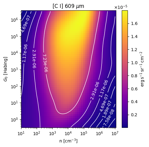 [C I] 609 µm Intensity emitted from the surface of a PDR as a function of the cloud density n and the FUV flux incident on the cloud G0. The above model is at a viewing angle of i=75 degrees, where i=0 is face-on. The models in the wk2020 ModelSet are based on Kaufman et al. 2006 , Wolfire et al. 2010, and Neufeld & Wolfire 2016. They use these parameters. More details are in the FITS headers.