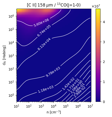 [C II] 158 µm / 13CO(J=1-0) Intensity Ratio emitted from the surface of a PDR as a function of the cloud density n and the FUV flux incident on the cloud G0. The above model is at a viewing angle of i=75 degrees, where i=0 is face-on. The models in the wk2020 ModelSet are based on Kaufman et al. 2006 , Wolfire et al. 2010, and Neufeld & Wolfire 2016. They use these parameters. More details are in the FITS headers.