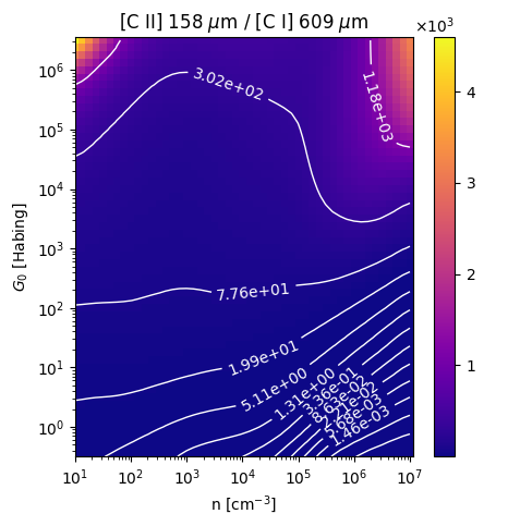 [C II] 158 µm / [C I] 609 µm Intensity Ratio emitted from the surface of a PDR as a function of the cloud density n and the FUV flux incident on the cloud G0. The above model is at a viewing angle of i=75 degrees, where i=0 is face-on. The models in the wk2020 ModelSet are based on Kaufman et al. 2006 , Wolfire et al. 2010, and Neufeld & Wolfire 2016. They use these parameters. More details are in the FITS headers.