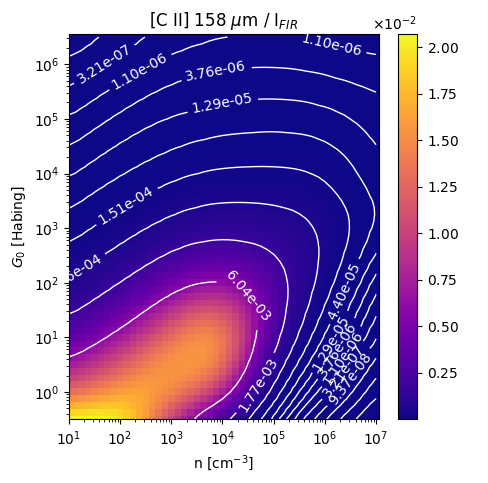 [C II] 158 µm / IFIR Intensity Ratio emitted from the surface of a PDR as a function of the cloud density n and the FUV flux incident on the cloud G0. The above model is at a viewing angle of i=75 degrees, where i=0 is face-on. The models in the wk2020 ModelSet are based on Kaufman et al. 2006 , Wolfire et al. 2010, and Neufeld & Wolfire 2016. They use these parameters. More details are in the FITS headers.
