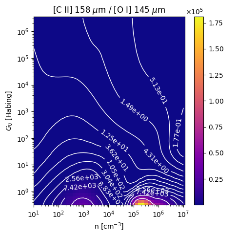 [C II] 158 µm / [O I] 145 µm Intensity Ratio emitted from the surface of a PDR as a function of the cloud density n and the FUV flux incident on the cloud G0. The above model is at a viewing angle of i=75 degrees, where i=0 is face-on. The models in the wk2020 ModelSet are based on Kaufman et al. 2006 , Wolfire et al. 2010, and Neufeld & Wolfire 2016. They use these parameters. More details are in the FITS headers.
