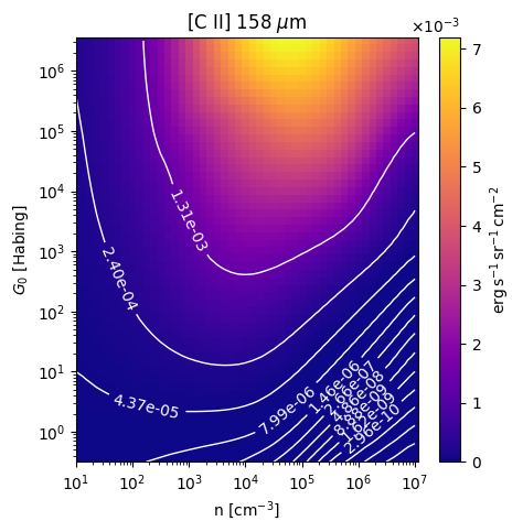 [C II] 158 µm Intensity emitted from the surface of a PDR as a function of the cloud density n and the FUV flux incident on the cloud G0. The above model is at a viewing angle of i=75 degrees, where i=0 is face-on. The models in the wk2020 ModelSet are based on Kaufman et al. 2006 , Wolfire et al. 2010, and Neufeld & Wolfire 2016. They use these parameters. More details are in the FITS headers.