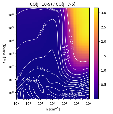 CO(J=10-9) / CO(J=7-6) Intensity Ratio emitted from the surface of a PDR as a function of the cloud density n and the FUV flux incident on the cloud G0. The above model is at a viewing angle of i=75 degrees, where i=0 is face-on. The models in the wk2020 ModelSet are based on Kaufman et al. 2006 , Wolfire et al. 2010, and Neufeld & Wolfire 2016. They use these parameters. More details are in the FITS headers.