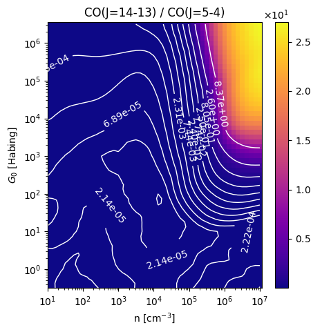 CO(J=14-13) / CO(J=5-4) Intensity Ratio emitted from the surface of a PDR as a function of the cloud density n and the FUV flux incident on the cloud G0. The above model is at a viewing angle of i=75 degrees, where i=0 is face-on. The models in the wk2020 ModelSet are based on Kaufman et al. 2006 , Wolfire et al. 2010, and Neufeld & Wolfire 2016. They use these parameters. More details are in the FITS headers.