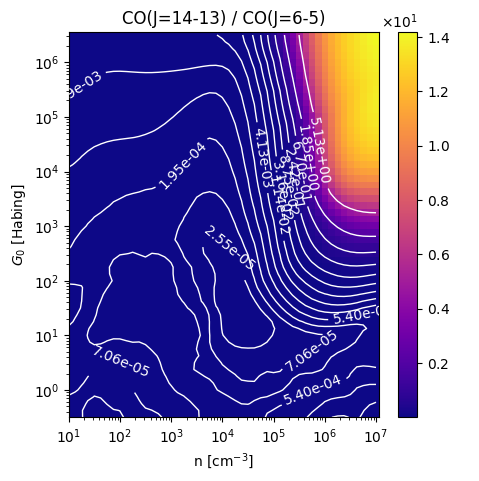 CO(J=14-13) / CO(J=6-5) Intensity Ratio emitted from the surface of a PDR as a function of the cloud density n and the FUV flux incident on the cloud G0. The above model is at a viewing angle of i=75 degrees, where i=0 is face-on. The models in the wk2020 ModelSet are based on Kaufman et al. 2006 , Wolfire et al. 2010, and Neufeld & Wolfire 2016. They use these parameters. More details are in the FITS headers.