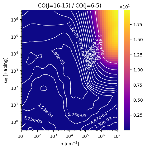 CO(J=16-15) / CO(J=6-5) Intensity Ratio emitted from the surface of a PDR as a function of the cloud density n and the FUV flux incident on the cloud G0. The above model is at a viewing angle of i=75 degrees, where i=0 is face-on. The models in the wk2020 ModelSet are based on Kaufman et al. 2006 , Wolfire et al. 2010, and Neufeld & Wolfire 2016. They use these parameters. More details are in the FITS headers.