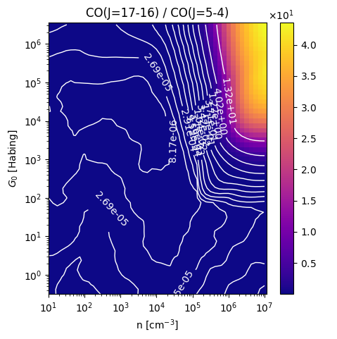 CO(J=17-16) / CO(J=5-4) Intensity Ratio emitted from the surface of a PDR as a function of the cloud density n and the FUV flux incident on the cloud G0. The above model is at a viewing angle of i=75 degrees, where i=0 is face-on. The models in the wk2020 ModelSet are based on Kaufman et al. 2006 , Wolfire et al. 2010, and Neufeld & Wolfire 2016. They use these parameters. More details are in the FITS headers.