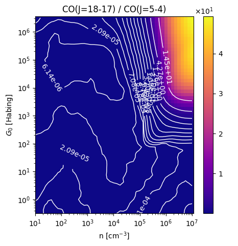 CO(J=18-17) / CO(J=5-4) Intensity Ratio emitted from the surface of a PDR as a function of the cloud density n and the FUV flux incident on the cloud G0. The above model is at a viewing angle of i=75 degrees, where i=0 is face-on. The models in the wk2020 ModelSet are based on Kaufman et al. 2006 , Wolfire et al. 2010, and Neufeld & Wolfire 2016. They use these parameters. More details are in the FITS headers.