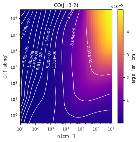 CO(J=3-2) Intensity emitted from the surface of a PDR as a function of the cloud density n and the FUV flux incident on the cloud G0. The above model is at a viewing angle of i=75 degrees, where i=0 is face-on. The models in the wk2020 ModelSet are based on Kaufman et al. 2006 , Wolfire et al. 2010, and Neufeld & Wolfire 2016. They use these parameters. More details are in the FITS headers.