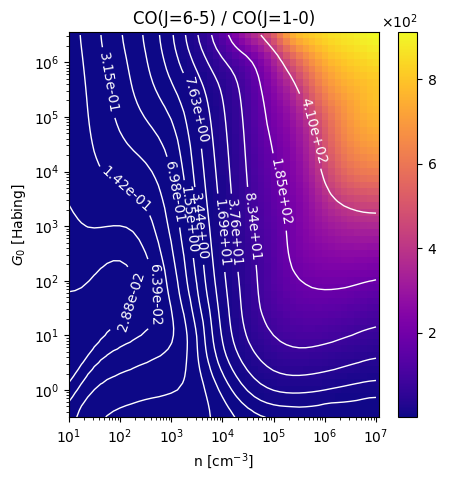 CO(J=6-5) / CO(J=1-0) Intensity Ratio emitted from the surface of a PDR as a function of the cloud density n and the FUV flux incident on the cloud G0. The above model is at a viewing angle of i=75 degrees, where i=0 is face-on. The models in the wk2020 ModelSet are based on Kaufman et al. 2006 , Wolfire et al. 2010, and Neufeld & Wolfire 2016. They use these parameters. More details are in the FITS headers.
