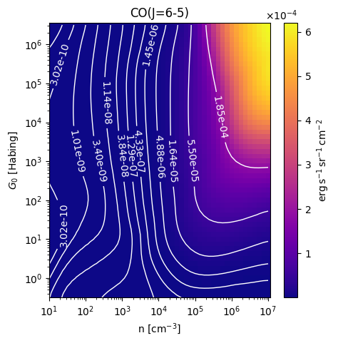 CO(J=6-5) Intensity emitted from the surface of a PDR as a function of the cloud density n and the FUV flux incident on the cloud G0. The above model is at a viewing angle of i=75 degrees, where i=0 is face-on. The models in the wk2020 ModelSet are based on Kaufman et al. 2006 , Wolfire et al. 2010, and Neufeld & Wolfire 2016. They use these parameters. More details are in the FITS headers.