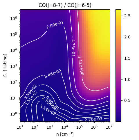 CO(J=8-7) / CO(J=6-5) Intensity Ratio emitted from the surface of a PDR as a function of the cloud density n and the FUV flux incident on the cloud G0. The above model is at a viewing angle of i=75 degrees, where i=0 is face-on. The models in the wk2020 ModelSet are based on Kaufman et al. 2006 , Wolfire et al. 2010, and Neufeld & Wolfire 2016. They use these parameters. More details are in the FITS headers.