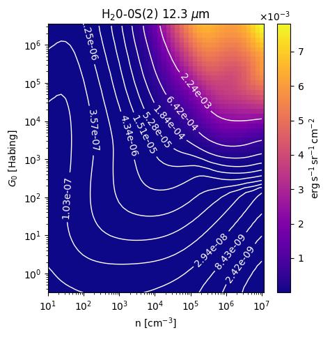 H20-0S(2) 12.3 µm Intensity emitted from the surface of a PDR as a function of the cloud density n and the FUV flux incident on the cloud G0. The above model is at a viewing angle of i=75 degrees, where i=0 is face-on. The models in the wk2020 ModelSet are based on Kaufman et al. 2006 , Wolfire et al. 2010, and Neufeld & Wolfire 2016. They use these parameters. More details are in the FITS headers.